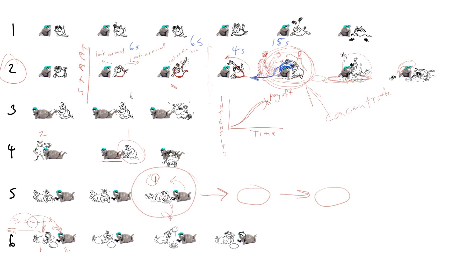 เลยมาสู่การเรียน ครั้งที่สองเมื่อวานครับ และนี่คือโฉมหน้าของ thumbnails sketches ของ 6 เส้น gag ที่ผมลองวาดไอเดีย เป็นชายเล็กที่กำลังหยอกล้อ เล่นกับ หุ่นอาร์ตทอยครับ วาดไปวาดมา เลยได้เห็นว่า ชายเล้กไม่ได้ดูเรียบร้อย เหมือนที่เค้าแสดงออกภายนอกเลย เวลาอยู่กับอาร์ตทอย (ที่บังเอิญปั้นตามเจ้าตัวเสียด้วยสิ) เจ้าตัวเลยออกอาการหมั่นไส้ขึ้นมาล่ะมั้งครับ ตุ๊กตาอะไร ใบเขียวยิ่งกว่ามนุษย์ต้นไม้ ทำให้ได้เป็นไอเดีย การทำอนิเมชั่นขนาดสั้น 6 แบบครับ โดย ที่เห็นเป็นคอมเมนต์ก็คือที่ไมค์ช่วย feedback กลับมาให้ครับ หนึ่งอย่างของการทำงานสร้างสรรค์ที่มีค่ามากๆ กับการฟังเสียงจากภายนอก เพื่อเอามาสะท้อนต่อว่า เราจะยังไงดี เห็นด้วยไม่เห็นด้วย อันไหนอยากเอามาปรับใช้ในงานบ้าง เป็นต้น จนเราคุยกันว่า น่าจะเป็นแนวทางที่ 2 ที่จะ develop ต่อครับ เพราะว่า ผมก็รุ้สึกท้าทายดี ที่จะได้วาด อนิเมตให้ชายเล็ก จากท่านอน มาเป็นเดินไปเดินมา จนสะดุด ลอยขึ้นกลางอากาศด้วย ประมาณนั้น ซึ่ง ถ้าจะเอาความรู้จาก Walt Stanchfield ที่เพิ่งอ่านเช้านี้มาใส่ด้วย ก็ต้องไม่ลืม เรื่องการวาด มือ และ เท้า ให้เห็นชัดๆ เพราะสองสิ่งนี้จะช่วย visualize story เพื่อ readibility ได้ดีมากๆครับ เป็นสิ่งที่ไมค์บอกผมเมื่อคืนพอดี คือบางโพสต์ยังดูแล้วไม่เก๊ทในทันที อันนี้ก็น่าสนใจมากนะ เรื่องของ